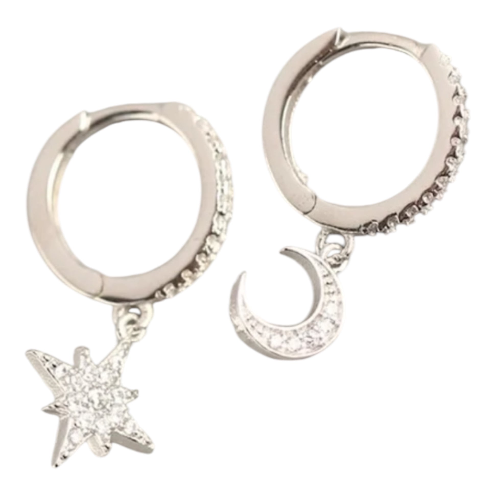 Add a touch of celestial charm to any outfit with our Silver moon and star Huggies. These dainty earrings feature delicate stars and moons that hug your earlobe for a unique and stylish look. Perfect for everyday wear or special occasions, these Huggies will make you shine like the night sky.